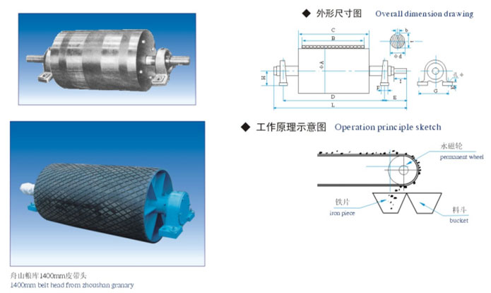 這種磁輪是水磁式的,磁鐵、軸和外周的滾筒成一個整體。最適合作為運輸機的頭部皮帶輪使用。由于能產(chǎn)生強大的磁場,因此分離能力大。其次這種類型結構簡單牢固,且外形及安裝尺寸與TD-75型帶式輸送機頭輪相同,使用維護簡便。